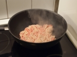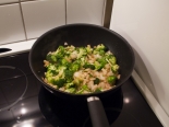 Jeg woker kjøttet for seg, for så å legge det bort når det såvidt er gjennomstekt. Jeg fortsetter med det som trenger lengst tid: gulerøtter, løk og brokkoli. (særlig brokkolien må bli myk nok, ellers smaker den ikke noe godt). Stilken på brokkolien er dessuten veldig god bare du skreller bort det ytterste laget. Så putter jeg på resterende men unngår å få for mye veske oppi. Vender ofte for å unngå å brenne grønnsakene. Heller kjøttet over til slutt og tilsetter chillisaus (eller wok-saus). Lars det så dampe en stund til jeg er fornøyd med brokkolien. Serverer med ris.