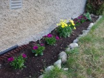 Nå er det blitt mai! Har jobbet en del i hagen i det siste. Langs gjerdet var det store busker som hadde grodd inn i hverandre og så ikke ut. Frem med en stor saks og vekk med alle grenene. Nå er det bare kjernen igjen og det ser mye mer ryddig ut. Jeg har også kjøpt 5 blomster på plantasjen jeg plantet i et lite bed jeg har. Omveltet først på jorden med en liten hakke, helte på masse vann, gravde noen små hull, stappet røttene nedi og pakket til med jord. Vannet så litt til.