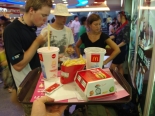 Vi finner en MacDonalds og en sushi bar. Vi utelukket sistnevnte og spiste en burger som ikke har smakt så godt noen gang før.