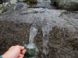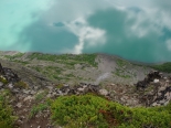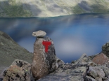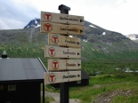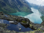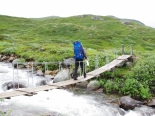 Søndag morgen starter vi enda tidligere å gå. Faktisk så tidlig som 0610. Vi hadde sett på bussruten at det gikk en buss 1010 fra Bygdin som vi tenkte å rekke. Turen vestover var beregnet til 3 timer, men siden det hadde regnet mye samt at vi var advart mot vanskelig bekk/fosskryssing valgte vi å ha ekstra god tid. Vi hadde begge ganske enkle vannavstøtende men ikke vanntette joggesko. Med tung sekk, kamera i den ene hånden og kartmappen i den andre balanserte vi så godt vi kunne fra sten til sten over små og store bekker. Det hadde regnet mye, og stiene var fulle av vann store deler av strekningen. Tørre sokker var en luksus vi kun klarte å opprettholde den første halvtimen. Takket være gode ullsokker var ikke vannet noe stort problem. Jeg begynte faktisk turen med noen enkle sorte sokker og fikk veldig tidlig noen små blemmer på hælen og lilletåa. Byttet så til ullsokker og problemet forsvant rett og slett. Som om ullsokkene dempet for all friksjon mellom skoen og foten.