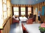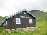 På Torfinnsbu bodde vi på sovesal og spiste middag. Her kostet det bare 550,- og hadde vi valgt 2-mannsrom hadde det bare kostet en 50-lapp mer. Det første som slår meg ved denne hytten er hvor koselig den er. Etter å ha tatt en dukkert i det iskalde vannet setter vi oss i en varm forstue med peis. Om ikke lenge kommer det stadig flere inn. Det var en mann i 50-årene som var veldig fjell-vant og som nå gikk med sin yngste datter og hun jeg regnet med var hans kone, det var en gutt litt under vår alder som nå gikk en ukes tur alene i fjellet, to jenter som jobbet sammen i Oslo, hun ene fra Danmark og hun andre fra Vinje som nesten satte i gang å bygge demning for å komme seg tørrskodd frem. I tillegg var det 3 fra et Baltisk land. Maten ble servert klokken 1900, samme tidspunkt som for Memurubu. Det var blomkålsuppe til forrett, etterfulgt av medisterkake til hovedrett og jordbær til dessert. Etterpå satt ganske lenge og pratet sammen.